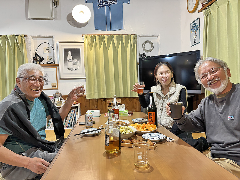 ![]() 左/向かって左の彼はリピーター。長野の地酒を土産にと。右のトリオは栃木からで、こちらからも地酒をいただきました。さあ、これから「飲み方、始めっ!」。(5/4) 右/栃木トリオが朝の出発準備。(5/5朝) |