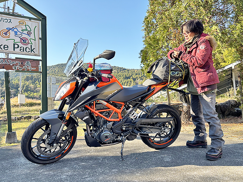 ![]() 以前Bike Packの池に放した、自分で飼っていた鯉が大きくなっているのを見て満足のカオリさん。 バイクはKTM 390 DUKE。(2枚とも12/7朝) |