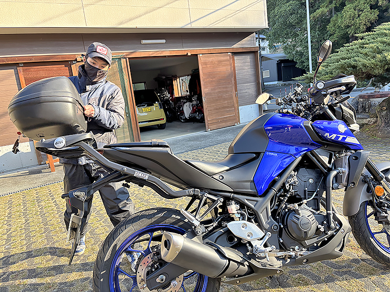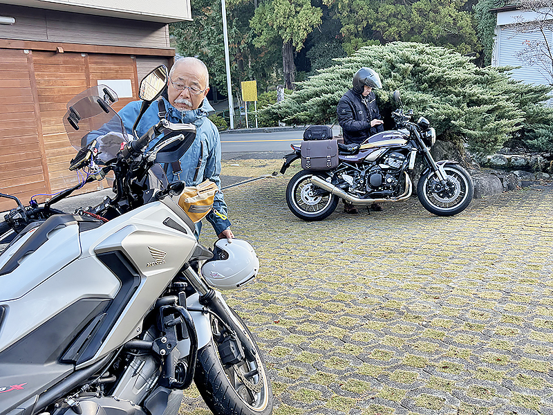 リピーターのNC700さんは九州ツーリングの帰りに宿泊。奥は新車のZ900RSさん。(11/30朝) |