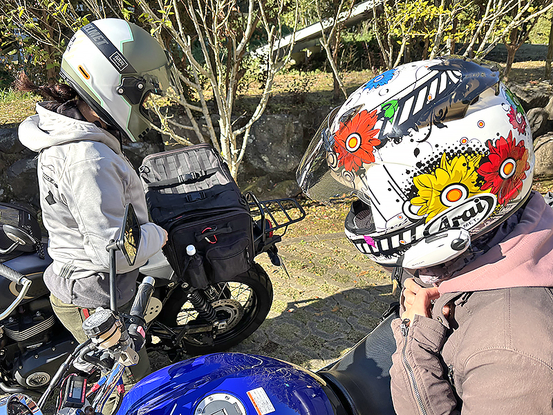 ![]() 左/ソロのCB250君と、お嬢さん2人組はトライアンフ・スクランブラーとXJR1300。今夜は3名だけですが若い人達だけというのはBike Packでは珍しいことです。(11/2) 右/トロピカル風とゴーグルをしているようなデザインの、ともにAraiヘルメット。 |