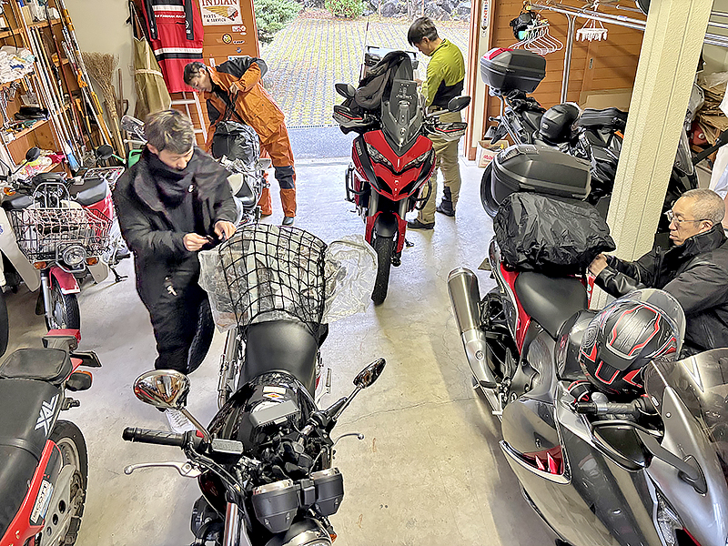![]() 原付ラリー初日の宿泊地にBikePackを利用してくれたのは今回が2度目です。スーパーカブやハンターカブ、スクーター等々全7台。バイクは小さいけれど、モトクロスブーツやアドベンチャースーツで身を固めて「なり」は本格派。 左/写真はスタート前にラリーのルートを示した『コマ図』を準備しているところ。 右/スタート前、まだくつろいでいるところ。このあと順番にスタートして伊豆スカイラインを横切って山の中に入って行きました。(2枚とも1/19朝) |