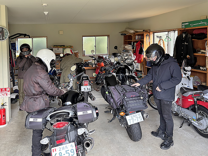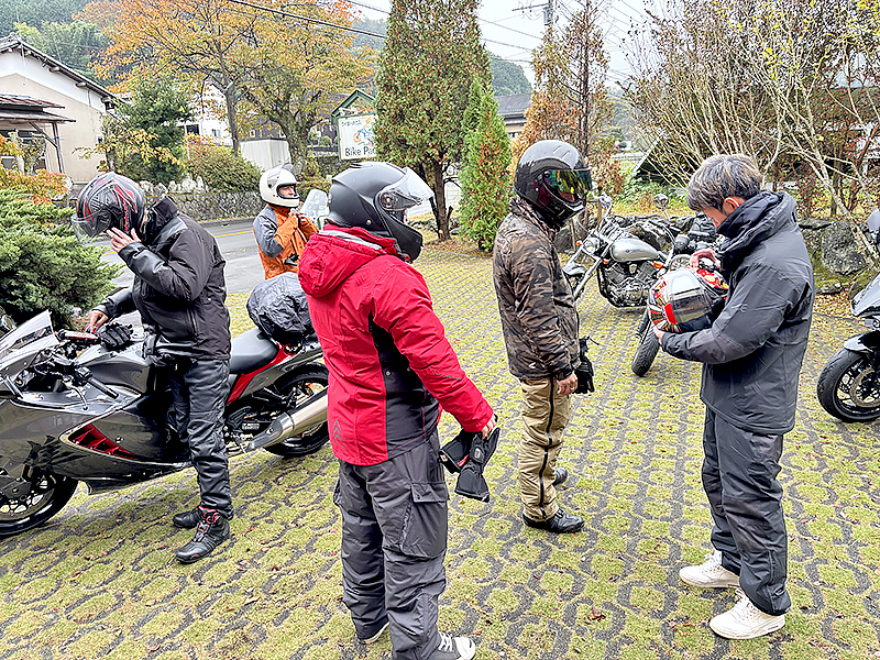 ![]() 左/明けて出発の朝は小雨となってしまいました。ガレージの中で合羽を着て荷造りです。(11/9) 右/5人は千葉県からのお客さん。インカムの設定中。(2枚とも11/9朝) |