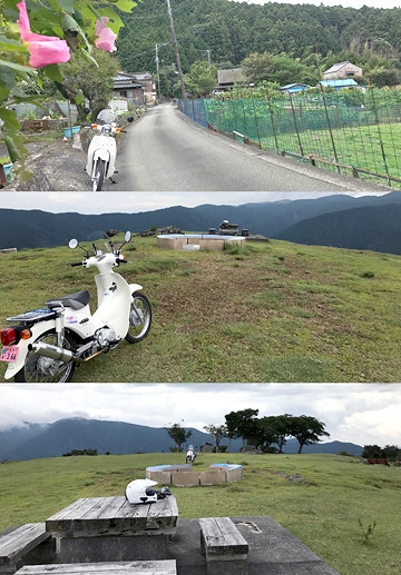 伊豆の秘境/西伊豆町大沢里、大城地区 2017/9 大城という集落です。(写真1枚目) 県道59号線から外れてさらに数キロ奥へと行くと数軒の集落がある。 窓を固く閉めた家もあって、住まっているのは見渡したところ5、6軒か? 左の花は芙蓉です。 この集落の道をさらに行くと滝見林道になります。以前はよく走りに来たものですが、今は入口にゲートがあって進入できないと思います。林道方向とは別の、もう一方の道を ――― 小石と小枝がたくさん落ちている簡易舗装の急な山道を2速でぐんぐん登って、行き着いた所が“丹野平”です。一面が野芝で覆われた広い頂上でした。(写真3、4枚目) 画像のカブとベンチの間にある丸く囲ったものは、ここからのパノラマ写真を並べたもので、晴れていれば富士山、静岡市、御前崎なども望めるということのようです。 大沢里は「おおそうり」と読みます。 |