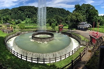 徳水園(とくすいえん)円筒分水工 2016/07/11 岩手県奥州市 一番外側の円の直径は31.5m、水があふれている円(分水槽)の直径は24mで日本最大級の円筒分水だそうです。 その規模、水量、美しさ、とても感動しました。 画像はパノラマなので少し歪んでいます。左側の水門から水を引き入れてサイホンのように中央の円筒(整流壁、直径9m)に湧き上がらせ、その円筒の下部には―――水中にあって見えないが―――多数の穴(オリフィス)があって、そこをくぐって分水槽へと導かれる。分水槽からあふれて出た水の約2/3を画像右側の赤い水門から流し、約1/3を左側の水門へと分けています。――― 分水工を真上から見て、一番外の円とあふれ出ている整流槽のあいだの12時と4時の位置に仕切りを設ければ、きれいに1/3と2/3に分けることができる―――そうしてここから下流の7,400haの田畑を潤しているそうです。 分水工を囲む一帯は親水公園になっており、駐車場も売店もトイレもあります。こんなところの駐車場が満車になることはめったに無いだろうと思われますが、わざわざ「二輪車」とペイントしたスペースを確保してくれているあたり、おかしくもほほえましい。後方の噴水は定時に15分間上がるようですが、分水工の役割とは全く関係ありません。 7/12 iPhoneからアップ。 |