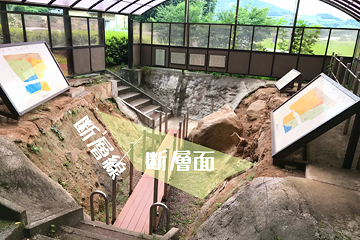 丹那断層 2017/7 函南町 静岡県東部、函南町の丹那盆地は田園風景が広がるのどかなところです。盆地の真下には東海道線と新幹線の『丹那トンネル』が通っています。この盆地のはずれに昭和5年に起きた『北伊豆地震』によって現れた断層が「保存」されています。 上/元は一つの円形に組まれた石垣が断層線の真上にあって、2つの半円に分断されて約2メートルずれている。 下/断層線に直行して深さ約3メートルの溝が掘られ、断層を観察できる『地下観察室』がある。溝の両側の壁には断層線がはっきりと認められる。 Bike Packから『丹那断層公園』までは約1時間です。 |