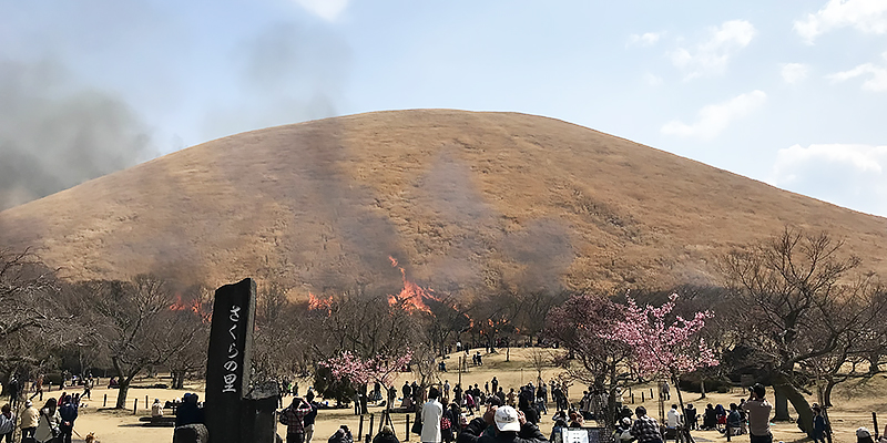 大室山の山焼き 2022/3 3/13(日)、伊東市大室山の山焼きが行われました。当初の実施予定日から雨と強風で3回も延期となり3週間遅れでようやく実施されましたが、車やバイクで大勢の見物客でした。 Bike Packから大室山までスーパーカブで行って15分ほど。11:35頃に着いて駐輪スペースは既にいっぱいでしたが、わずかなスペースでも停められるのがカブの利点。 正午、山焼き開始を告げる花火が打ち上げられてから約20分ほどで頂上まできれいに燃え尽きました。ムラも無くきれいに燃えたけれど、火の高さや音、伝わってくるはずの熱も弱くて迫力にはチョット欠けたか? 上/時刻 12:08 正午点火の直後です。 中/時刻 12:13 上/時刻 12:20 きれいに焼き尽くしました。 |