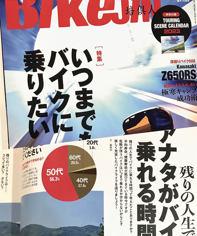 ![]() バイクを降りるとき 2022/12 雑誌『BikeJIN』の「いつまでもバイクに乗りたい」という特集に惹かれて買ってみました。私もそんな事を意識するような歳になりましたから。 いつまで乗れるかーーー記事では体力面やモチベーションの他に金銭的、家庭的問題もあげていますが私も同感。年金生活者にはディーラーでの整備も含めた車検費用はかなりきつい。 別の記事で「60になった時、バイクを続ける事を息子たちに納得させられるか?」という記事がありましたが60でそんなこと言うのは早すぎです。歳というものは私の実感では若い人から見ると50、60はかなり年寄りに見える、見えたものですよ。70なんてヨボヨボじじいか! でも自分が60、70とその歳になってみると「なんだ、まだまだ若いじゃないか」と。勿論、飛んだり跳ねたりは若い人には敵わないけれど 思うほど弱っちゃいないもの。筋肉だって鍛えればまだ付きます。ですから健康でありさえすれば80でも90・・・ここまではさすがに無理か。 |