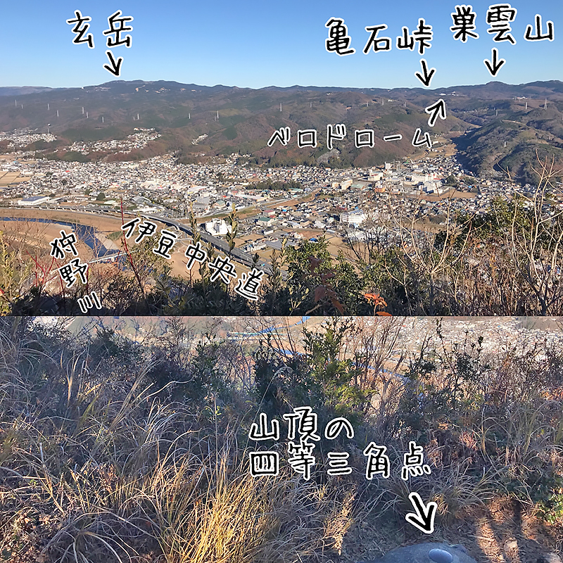日本百低山? 2023/12 よく晴れて風も無い日、伊豆の国市大仁(おおひと)の城山(じょうやま)に登ってみました。 登山と言えるほどの山ではありませんが、コースには大小の石が突き出たり転がっていたりしてとても歩きにくい。それというのも城山はマグマの固まった、いわゆる火山岩頸(がんけい)と呼ばれる岩山だからです。 垂直にそそり立った南壁でロッククライミングをしているのを以前には良く見かけたものですが近年はさっぱり。なのにこの日はクライマーの姿を久しぶりに見かけました。 頂上からは田方平野が一望できます。日本百低山の一つに数えたいですね。登りの所要時間は45分でした。 |