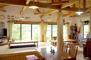食堂兼談話室兼居間、ときどき宴会(怪)場。 和風洋風山小屋風ごっちゃ混ぜ。ピアノもあります。 ●360°ムービー 真ん中の柱を背にしてぐるっと一回り。 |