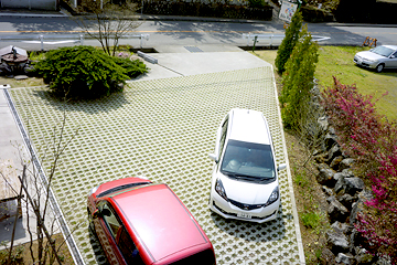駐車場は芝を植え込んだ植生ブロックによる舗装です。 うっかり芝の部分にサイドスタンドを立てたりしたらバイクを倒してしまうので注意してください。 |