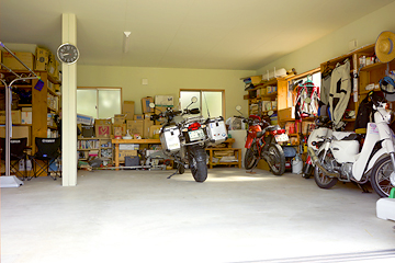 大型バイクでも10台くらいは入りますが、隙間なく上手に寄せてね! 夜は施錠します。 引越し直後の荷物がそのまま、物置・物干し場ともなっているありさま! |