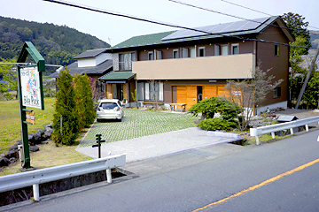 1階が玄関やガレージで、2階が客室です。左奥の建屋は食堂。 手前の道路が県道12号線で、右が修善寺方面、左は伊東方面です。入口の看板が目印。 ●全天パノラマ 庭の真ん中でぐるっと一回り。(フル画面で開きます) |